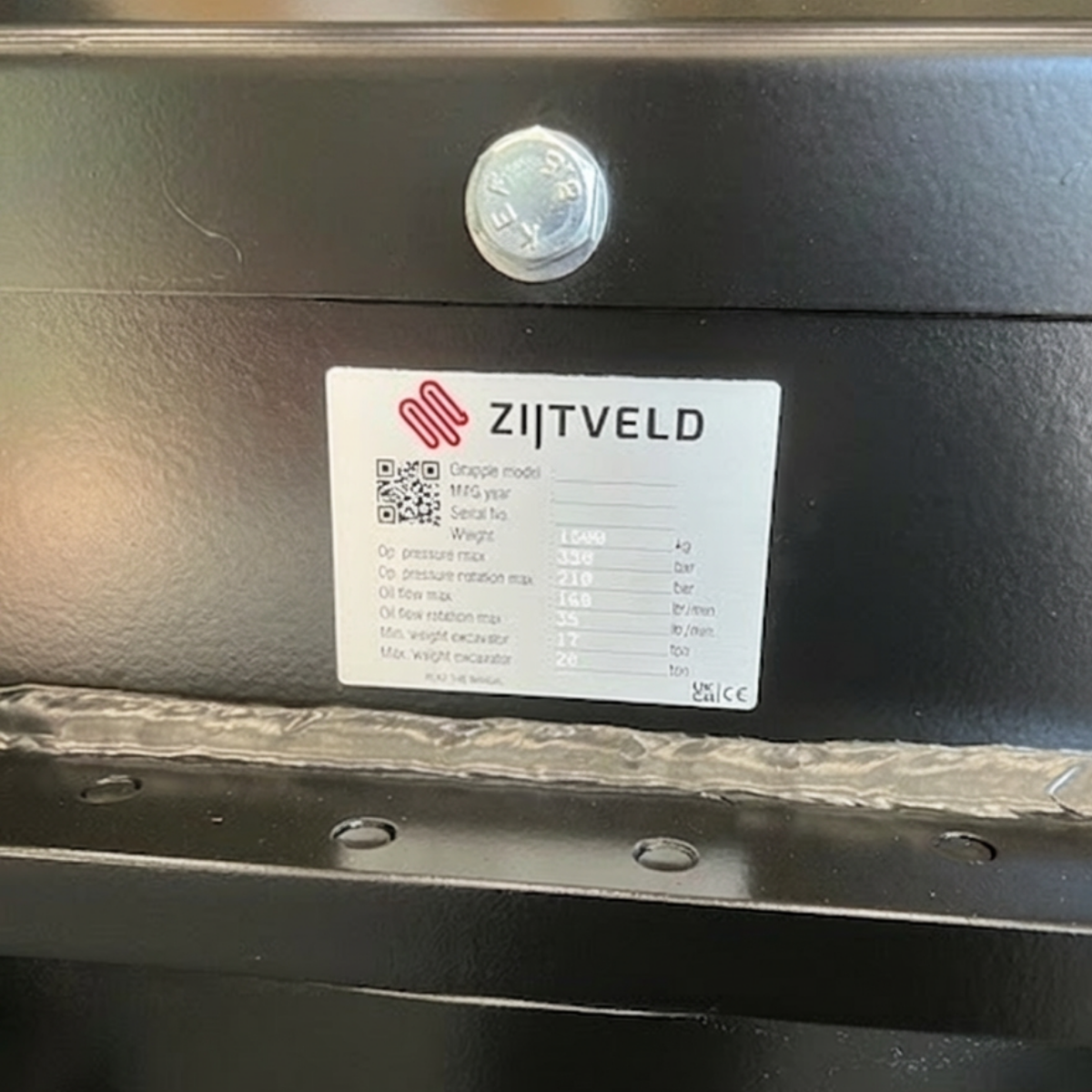 Bij Zijtveld draait het om eenvoud die werkt. Deze QR-code is discreet bevestigd op het hoofdframe van de grijper en werkt met elke standaard smartphone. Er is geen speciale app nodig, alleen een camera.